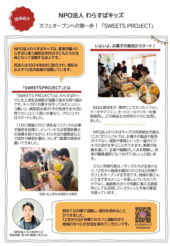 NPO法人わらすばキッズは、星華学園・わらすばに通う高校生年代の子どもたちが主体となって活動する法人です。同法人は2024年8月に設立され、現在はおよそ15名の会員が活動しています。