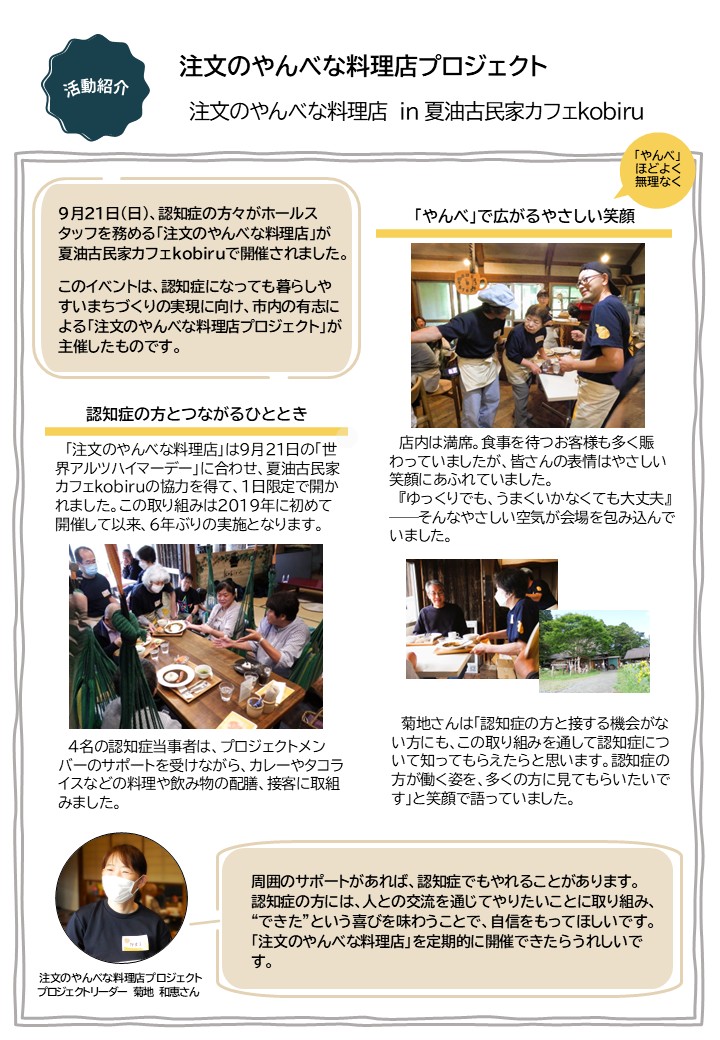 9月21日(日)、認知症の方々がホールスタッフを務める「注文のやんべな料理店」が夏油古民家カフェkobiruで開催されました。このイベントは、認知症になっても暮らしやすいまちづくりの実現に向け、市内の有志による「注文のやんべな料理店プロジェクト」が主催したものです。