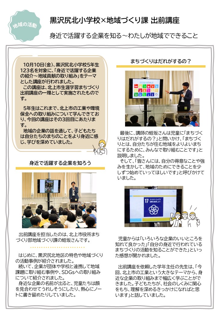 10月10日(金)、黒沢尻北小学校5年生123名を対象に、「身近で活躍する企業の紹介~地域貢献の取り組み」をテーマとした講座が行われました。この講座は、北上市生涯学習まちづくり出前講座の一環として実施されたものです。