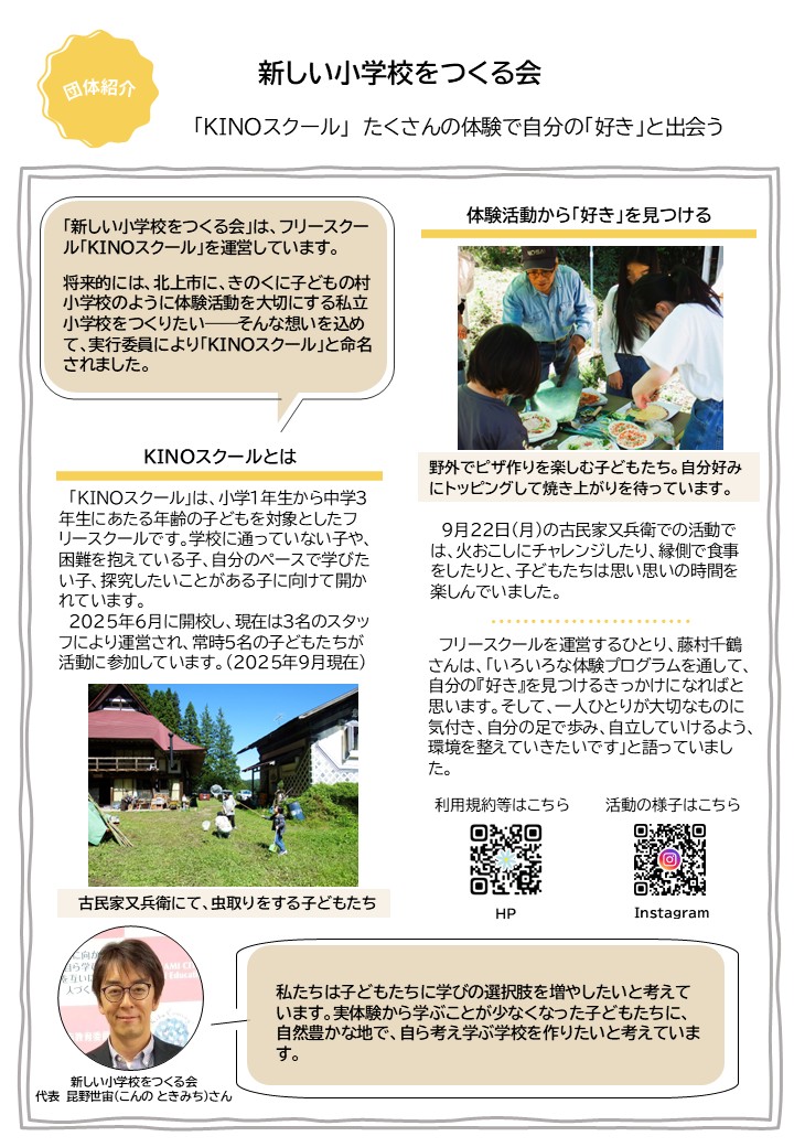 「新しい小学校をつくる会」は、フリースクール「KINOスクール」を運営しています。将来的には、北上市に、きのくに子どもの村小学校のように体験活動を大切にする私立小学校をつくりたい——そんな想いを込めて、実行委員により「KINOスクール」と命名されました。