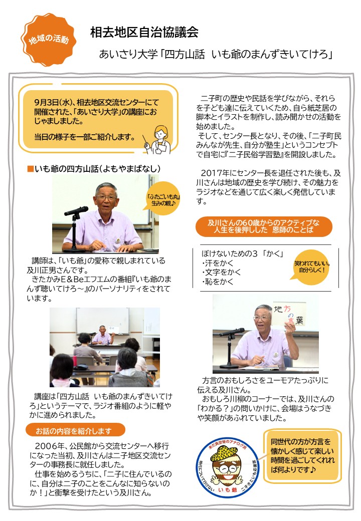 9月3日(水)、相去地区交流センターにて開催された「あいさり大学」の講座におじゃましました。